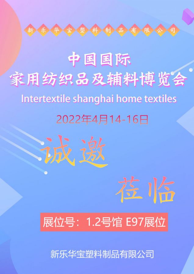 新樂華寶塑料制品有限公司于2022年4月14-16日參加上海中國國際家用紡織品及輔料博覽會(huì),誠邀您的參加! 中國國際家用紡織品及輔料博覽會(huì) Intertextile shanghai home textiles 展位號(hào):1.2號(hào)館 E97展位 時(shí)間:2022年4月14-16日 上一個(gè):新樂華寶與您相約8月9日-11日中國(寧波)出口跨境電商博覽會(huì) 下一個(gè):新樂華寶塑料制品有限公司于2022年6月1-3日跨境電商交易會(huì),誠邀您的參加!